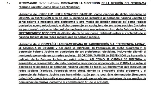 En la resolución N° 123 comunica que se obtuvo conformidad respecto a lo impuesto en la sentencia, especialmente a la prohibición indicada hacia Benavides y el canal Latina. Asimismo, la medida fue notificada al comediante peruano, quien deberá eliminar el contenido de su imitación tanto en sus redes sociales privadas como en las de su programa.